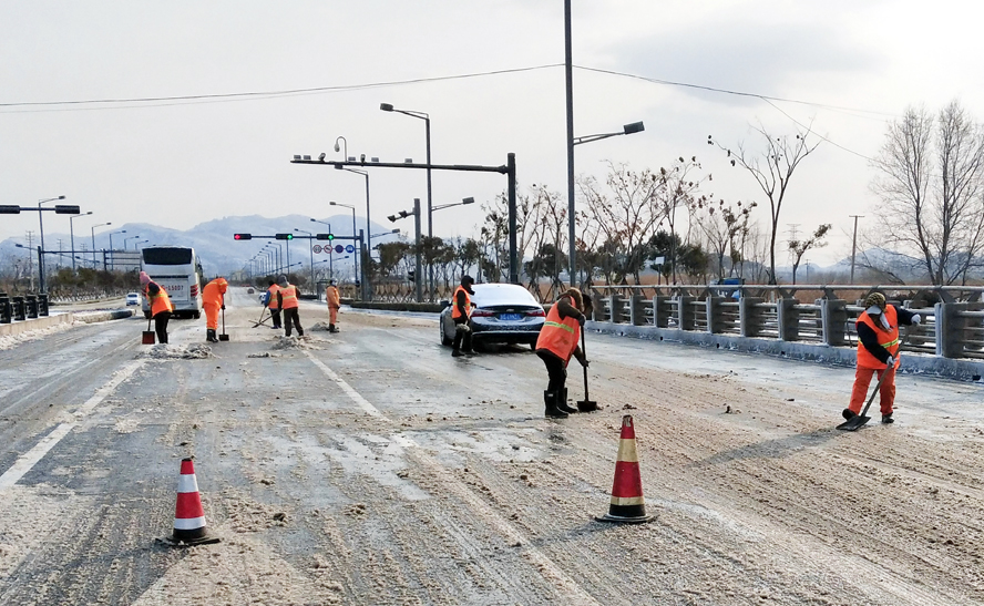 裕升、裕欣、裕祥三家養護公司組織綠化、保潔人員配合除雪車、裝載機等機械設備對花果山大道、黃海大道、東方大道、242省道、新光路及大浦路等主干道進行清雪作業;對程圩橋、先鋒大橋等橋面易積雪路段以及馬山路立交、新光路涵洞等“上跨下穿”路段采用撒氯化鈣的方式,加速積雪融化,并安排人員及時掃除積雪,防止路面因低溫降雪產生冰凍,對交通安全造成影響;對創智綠園廣場、火車站廣場及匝道等窗口地段采用人機結合的形式清掃積雪。盛達市政公司、瑞泰服務公司及益豐園林公司在提供鏟車、平板車、裝載機等機械車輛配合掃雪的同時,積極做好后勤服務,為清雪工作有序開展提供保障。截至到中午,各條主干道積雪已基本清理完畢,道路恢復暢通,保障居民出行和交通安全。