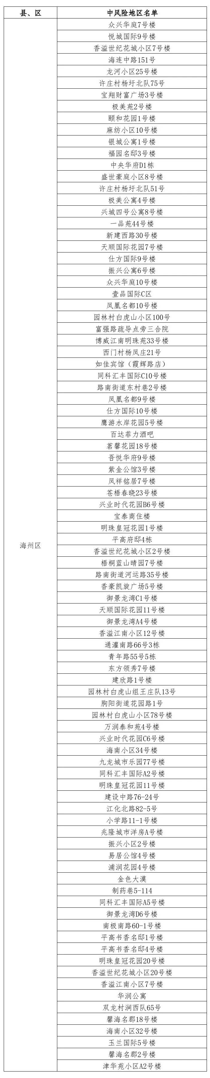 據國務院聯防聯控機制有關規定,經市指揮部研究決定,自發布之日起,對我市部分區域疫情風險等級進行調整:開發區久和國際新城二期33號樓由中風險地區調整為低風險地區。其他地區風險等級不變。調整后全市現有90個中風險地區。 連云港市中風險地區(90個)