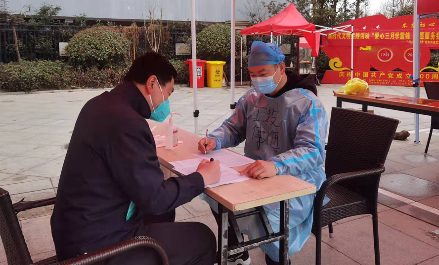 在該小區(qū)核酸檢測點(diǎn),一名身穿防護(hù)服的男生也引起了大家的注意,在整齊的隊(duì)伍旁邊,他忙碌地來來去去,一會兒維持秩序,一會兒將行動(dòng)不便的老年人引導(dǎo)到綠色通道前,忙得不亦樂乎。這位小伙子叫袁晨,是上元公司的一位預(yù)備黨員,當(dāng)居民問到他累不累時(shí),他笑了笑:“我是一名青年,那些醫(yī)護(hù)人員和社區(qū)工作者才辛苦。我覺得,穿上防護(hù)服的那一刻,我仿佛也成為了一名白衣天使,雖不及醫(yī)護(hù)人員那么偉大,但做著自己力所能及的事,為疫情防控貢獻(xiàn)一份力量,我發(fā)自內(nèi)心的快樂,渾身也充滿力量。”