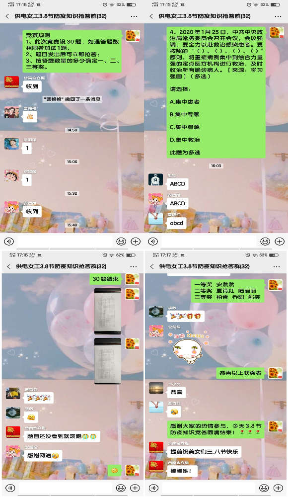 值此2020年第110個國際“三八”婦女節(jié)來臨之際,為了讓公司女職工在做好自身疫情防護(hù)的前提下,能夠度過一個健康、愉快、充實(shí)的節(jié)日,公司女工委利用微信群組織全體女職工開展了慶“三八”抗新冠疫情防護(hù)知識搶答賽活動。