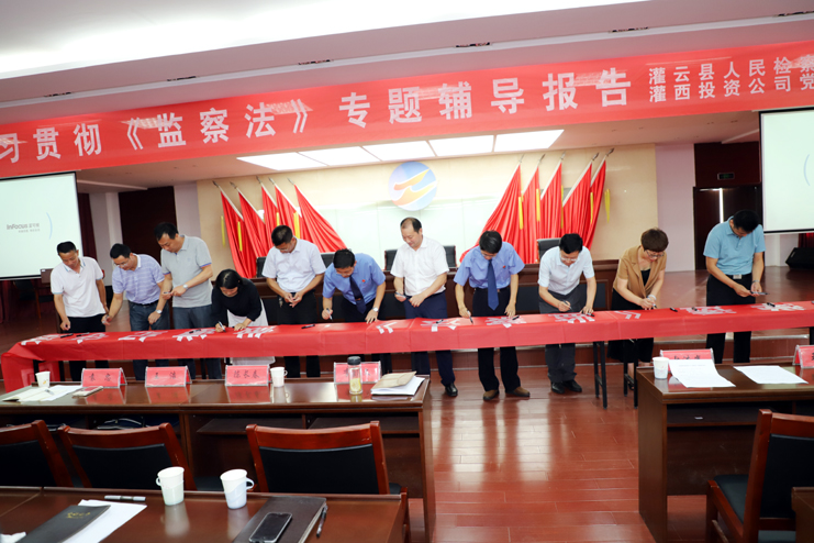此次集中培訓只是我公司深入學習貫徹監察法的舉措之一,按照公司紀委統一部署,把監察法納入公司干部必修課程及各類黨員培訓內容,通過座談會、報告會等多種形式,深化學習培訓效果,把學習培訓延伸到基層一線。會后全體與會人員集體在“學深學透《監察法》,做遵紀守法國企人”橫幅上簽字承諾。(張明建)