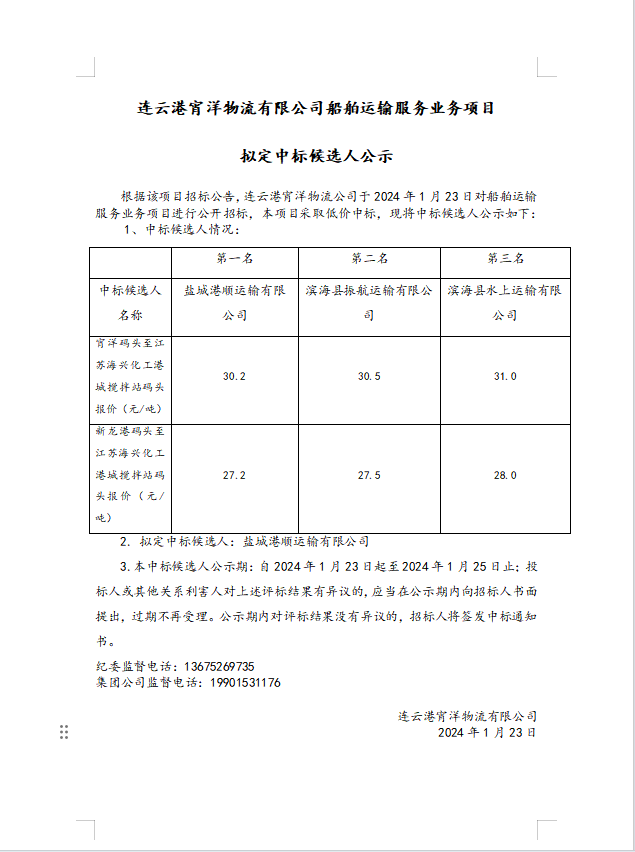 連云港宵洋物流有限公司船舶運輸服務業務項目擬定中標候選人公示