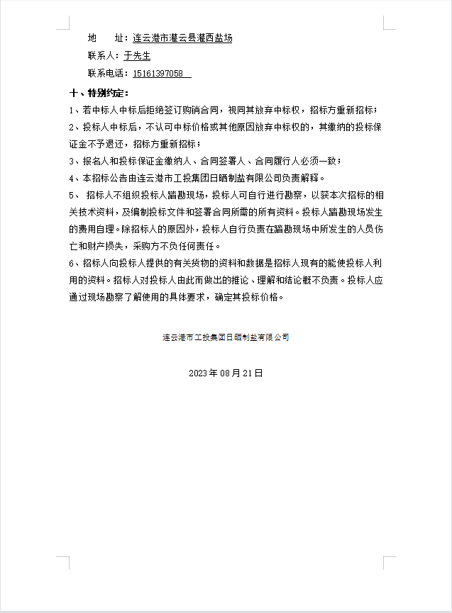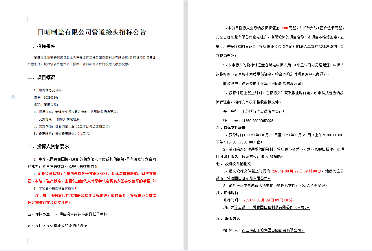 日曬制鹽有限公司管道接頭招標公告