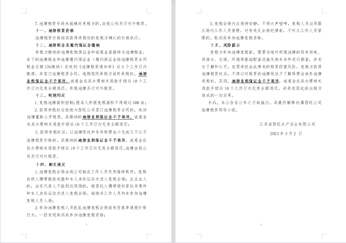 江蘇省西旺水產(chǎn)實(shí)業(yè)有限公司2023年度淡水養(yǎng)殖池塘公開競(jìng)租公告