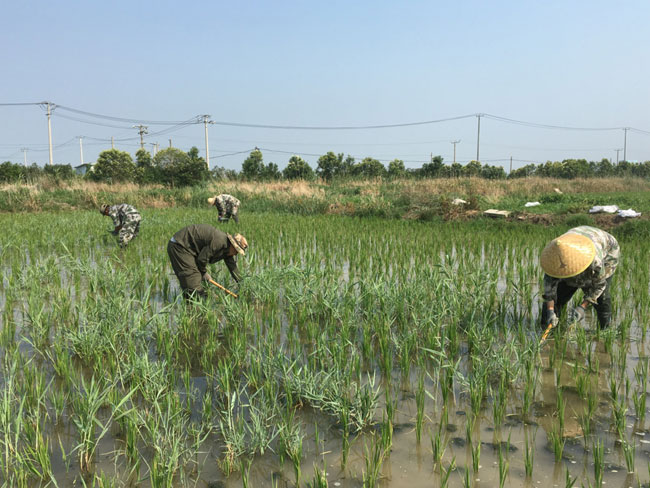 盛夏時節(jié),正是水稻生長關鍵期,生態(tài)種養(yǎng)中心的職工在烈日下手工拔除水稻間的雜草。為確保稻米的品質,中心堅持利用人工除草作業(yè),減少化學農(nóng)藥的使用。 (莫宗剛)