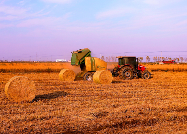 (摟草機和秸稈打包機正在地里作業(yè))