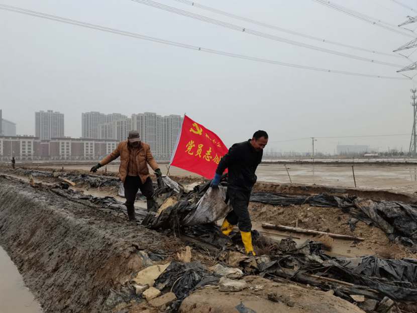 勞動現場,鮮紅的“黨員突擊隊”旗幟迎風飄揚,凜冽的寒風夾雜著細雨,絲毫不減大家的勞動熱情,個個汗流浹背、滿身泥漿,不怕臟不怕累,經過3個小時的突擊勞動,共清理1200米、16車池埝垃圾。