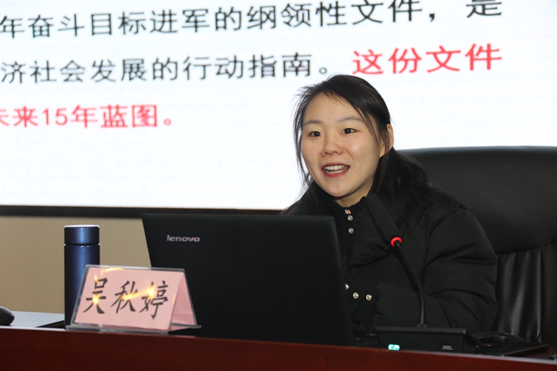 吳秋婷副主任在題為“開啟全面建設社會主義現代化國家新征程”報告中,從新階段與新目標、新理念與新部署、新變化與新格局等三個方面給大家解讀了黨的十九屆五中全會精神。“新階段與新目標”部分,介紹了我國在決勝全面建成小康社會取得的三大決定性成就,即十三五期間,全面深化改革取得重大突破;經濟實力、科技實力、綜合國力躍上新的大臺階。在“新理念與新部署”部分,從社會發展、創新發展、統籌發展等角度分別提出了習近平總書記在新時代下對中國共產黨人的要求以及我國社會發展必須遵循的基本原則。在“新變化與新格局“部分,強調實現“十四五”規劃和2035年遠景目標意義重大、任務艱巨,但是前景光明,全黨全國各族人民要緊密團結在以習近平同志為核心的黨中央周圍,同心同德,頑強奮斗,積極響應十九屆五中全會對全黨全國人民的號召,奪取全面建設社會主義現代化國家的勝利。