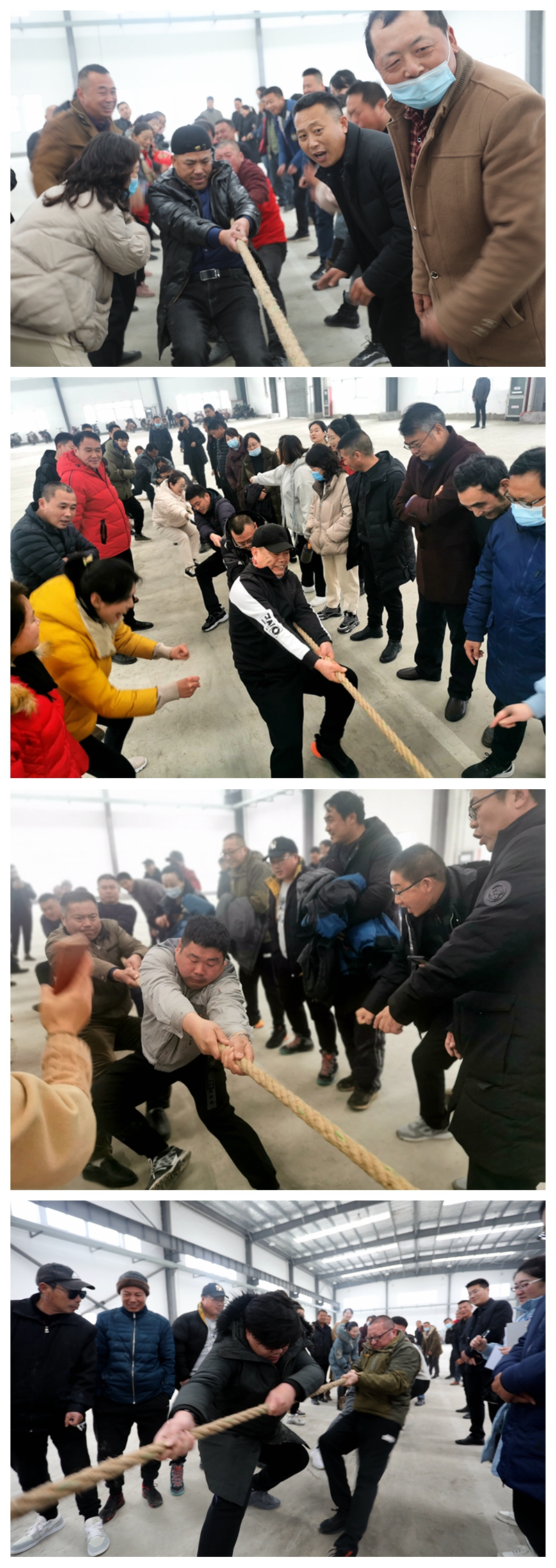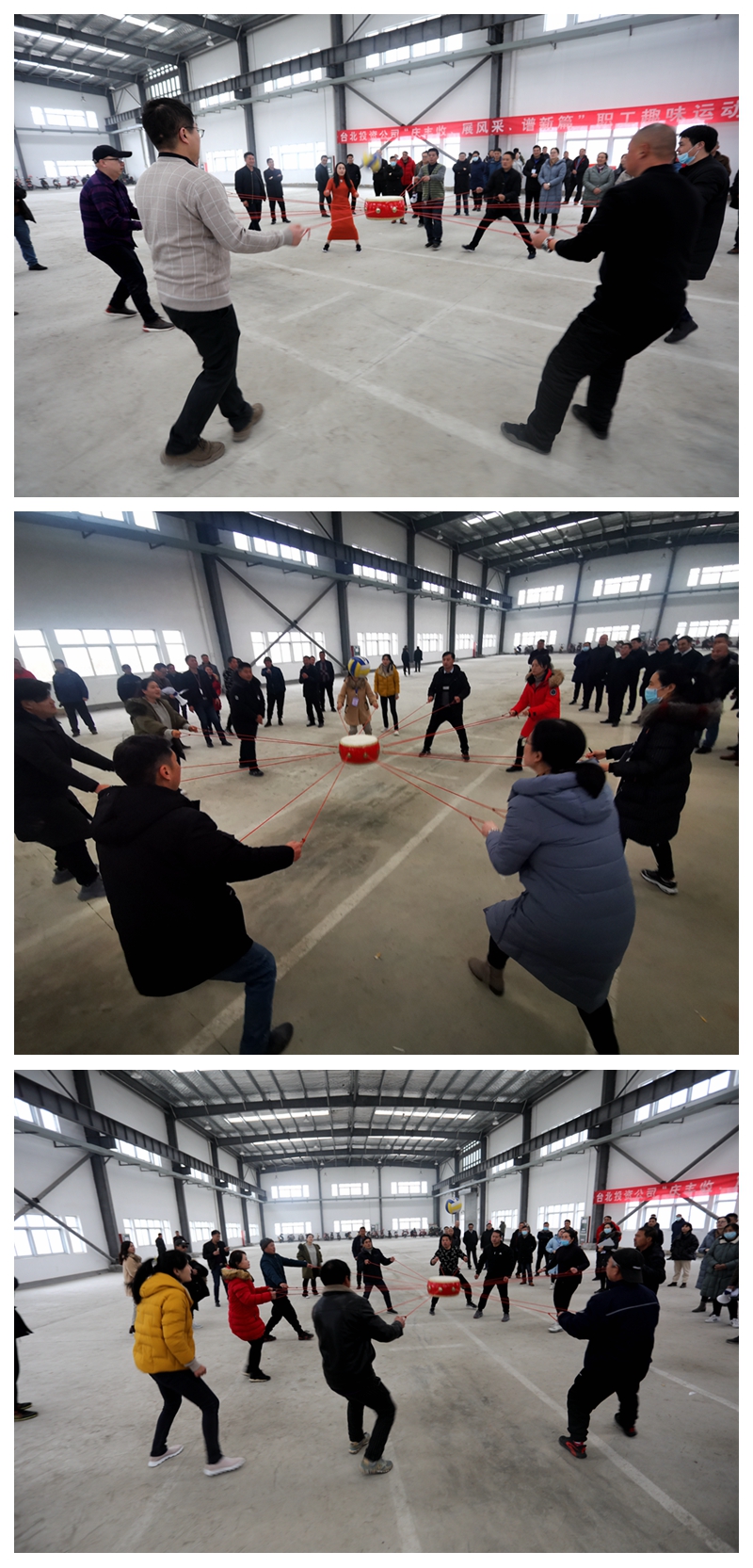 陽光熹微,冬日似金。為喜迎2021年新年的到來,大力弘揚團結拼搏,昂揚向上、奮發有為的精神風貌,營造生動活潑、寬松和諧、積極健康的良好氛圍,1228日下午,投資公司在海州灣公司9號廠房舉辦“慶豐收、展風采、譜新篇”迎元旦職工趣味運動會。本次趣味運動會分為拔河、同心擊鼓、企鵝漫步、快樂點球等四個項目,分為兩天舉行,本日舉行拔河、同心擊鼓兩項比賽。