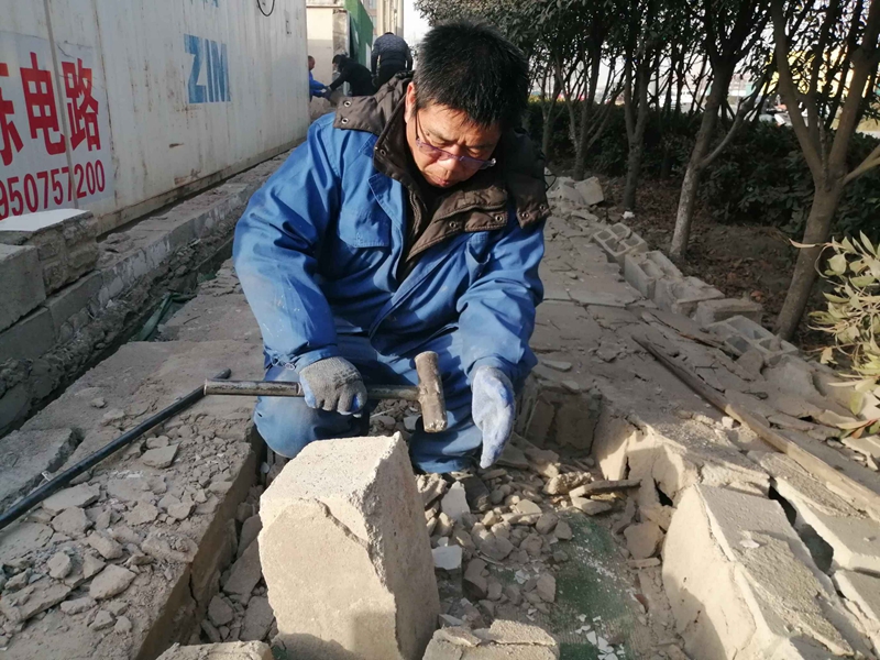 據悉,該處墻頭整體倒塌,大多數磚塊沒有受到損壞。志愿者們一塊一塊的挑選、清理、搬運,將可以回收利用的磚塊整理好,用于墻頭的修葺。水泥、沙的配比不太熟悉,天氣寒冷如何做好防凍,怎么辦?臨達公司的退休老黨員主動站了出來,為圍墻修葺工作做指導,提供幫助。經過兩天的奮戰,將倒塌的墻頭修葺好,并拉好了美化綠布。